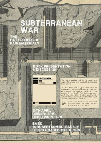 Act for freedom now! - Friday, March 27, 2026Subterranean War: The Battlefield for Raw Materials Book presentation & discussion 12th April, BASE Bristol 25 Robertson Rd BS5 6JY Pay What You Can vegan dinner 6pm Discussion 7pm The latest pocketbook in the anarchist series Hourriya, now available in English translation. What does this work of anarchist analysis offer us now, in the south … Continue reading Subterranean War: The Battlefield for Raw Materials Book presentation & discussion (Bristol,UK) →