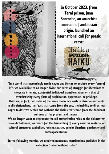 Presentazione del progetto “Haiku Senza Haiku” e del nuovo appello internazionale “Radici e Radicalità”, nato dal dialogo cartaceo tra Miguel Peralta, anarchico prigioniero nelle carceri del cosiddetto Messico e Juan Sorroche, compagno detenuto in quella che ancora chiamiamo Italia.