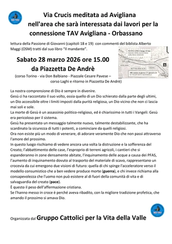 notav.info - Friday, March 27, 2026Sabato 28 marzo 2026 ore 15.00 da Piazzetta De Andrè (corso Torino – via Don Balbiano – Piazzale Cesare Pavese-corso Laghi e ritorno in Piazzetta De Andrè) Lettura della Passione […]