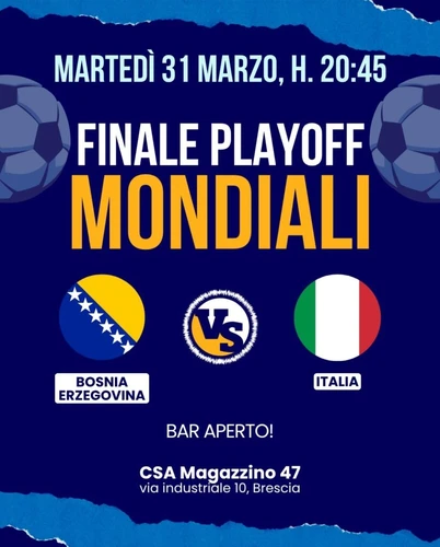 Guardiamo insieme la partita di calcio Bosnia Erzegovina – Italia, finale playoff delle qualificazioni ai Mondiali di Calcio 2026. Una serata di sport e socialità al centro sociale di via Industriale, 10 a Brescia. Ti aspettiamo! Bar aperto!