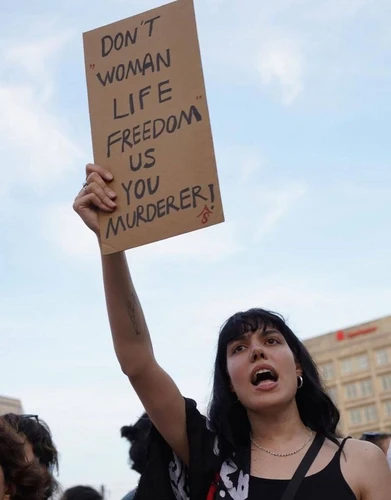 Una donna iraniana in piazza durante la guerra dei 12 giorni del giugno 2025: «Non donnavitalibertàteci, assassini!»