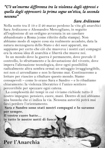 Per Sara e Sandro. Manifesto e striscioni “C’è un’enorme differenza tra la violenza degli oppressi e quella degli oppressori: la prima segue un’etica, la seconda nessuna”Sara Ardizzone Nella notte tra…