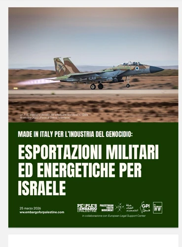Weapon Watch - Saturday, March 28, 2026Ricercatori indipendenti e palestinesi hanno pubblicato un importante rapporto che prova l’ampiezza della complicità italiana con Israele nelle violazioni del diritto umanitario e dei trattati internazionali ai danni della popolazione palestinese.