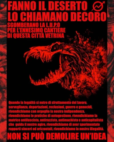 Brughiere - Monday, March 30, 2026Condividiamo questi testi di aggiornamento dalla Palestra L.U.P.O di Catania. Il 21 marzo lx compagnx hanno ricevuto notizia dell’imminente demolizione dell’edificio e cantierizzazione dell’area, per realizzare l’ennesimo progetto di “riqualificazione urbana” finanziato con i soldi del PNRR. Da quel giorno, compagnx e solidali resistono in presidio permanente contro le ruspe del Nulla che avanza. Tutta … Leggi tutto "CATANIA: NOTIZIE DALLA PALESTRA L.U.P.O. [IN AGGIORNAMENTO]"
