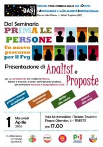 Pressenza - Monday, March 30, 2026Mercoledì 1 aprile 2026, alle ore 17.00 presso la Sala Multimediale «Tiziano Tessitori» di Piazza Oberdan 5 a Trieste, la Rete DASI FVG — Rete del Friuli Venezia Giulia per i Diritti, l’Accoglienza e la Solidarietà Internazionale — presenta il documento conclusivo del seminario Prima le Persone. Un nuovo percorso per il Fvg.