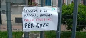 Così, nel suo piccolo, questa iniziativa ha avuto questo percorso. Diverse persone, tra le tante che fanno tutto quello che possono per fermare il massacro in Palestina, hanno risposto a questo appello e hanno deciso di non farlo da soli e da sole dalle finestre, ma di unirsi in strada o in uno slargo o in una piazza e fare tutto il rumore possibile, spiegando a chi passava o sentiva dalle finestre che lo si faceva contro il genocidio in corso. Vi proponiamo quindi qualche immagine arrivata da quella sera. Tra l’altro, pochi giorni dopo, lo stesso potente rumore venne replicato in apertura del corteo del sabato a Milano, con grande successo.
