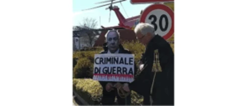 Mentre Netanyahu veniva condotto davanti alla Corte Penale Internazionale, raffigurata da un attivista travestito da giudice, gli si avvicina un attore che impersonava l’AD di Leonardo SpA, Cingolani, che con al proprio fianco un’attrice che impersonava Giorgia Meloni, consegna al premier israeliano un M346 (riprodotto su cartone).