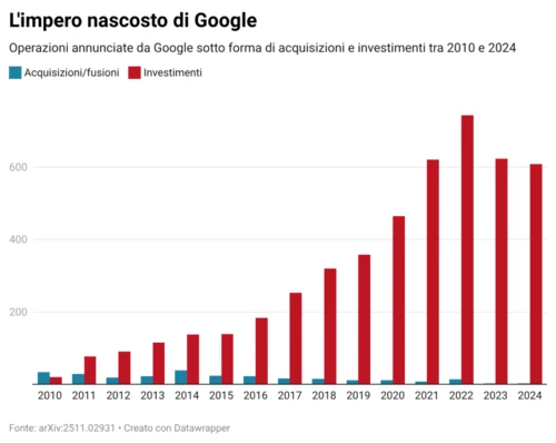 Nel suo database, PitchBook distingue, infatti, tra “acquisizione”, cioè la presa del controllo di un’azienda da parte di un’altra attraverso l’acquisto di quote di capitale, e gli “investimenti”, in cui l’acquisto di capitale dà invece diritto a una percentuale inferiore al 15% nei diritti di voto all’interno dei consigli di amministrazione. Seguendo questa distinzione, gli autori hanno analizzato il comportamento di Google tra il 2010 e il 2024.