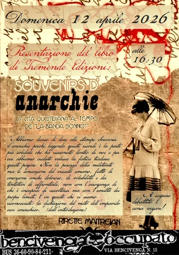 Domenica 12 aprile alle 16:30 al B15 la curatrice del libro presenterà Souvenirs d’Ararchie. La vita quotidiana al tempo della Banda Bonnot, di Rirette Maîtrejean, recentemente uscito per Tremende Edizioni. A seguire, dibattito aperto e cena vegan.