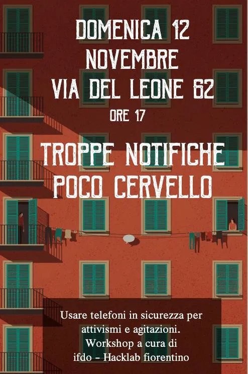 If_Do - Wednesday, November 1, 2023Domenica 12 novembre 2023 Occupazione di Via del Leone 62 Ore 17 Troppe notifiche poco cervello Usare i telefoni in sicurezza per attivismi e agitazioni Workshop a cura di if_do hacklab fiorentino. Alcuni dei più importanti strumenti a nostra disposizione … Continue reading →