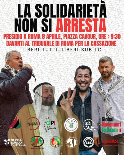 Soccorso Rosso Proletario - Monday, April 6, 2026L’8 aprile scendiamo in piazza davanti alla Corte di Cassazione, nei giardini di Piazza Cavour, per gridare forte che non resteremo in silenzio. In quel giorno si terrà il ricorso in Cassazione di Mohammad Hannoun, Raed Dawoud, Yaser Elasaly e … Continua a leggere→