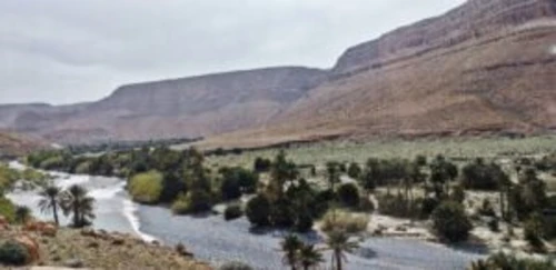 Lungo la strada a noi si accompagna sulla destra un corso d’acqua che ci regala il verde di un anticipo di oasi e i merli di un caravanserraglio mentre improvvisamente, a sinistra, si stende, nel rosso estremo della terra, uno specchio azzurro di lago. E ancora terra e tetti d’argilla cruda e palme.