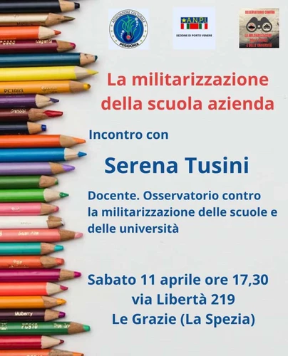 Sabato, 11 aprile alle 17,30 a Le Grazie, via Libertà 219 a La Spezia, Serena Tusini, docente, attiva nell’Osservatorio contro la militarizzazione delle scuole e delle università interverrà in un incontro pubblico dal titolo “La militarizzazione della scuola azienda”.