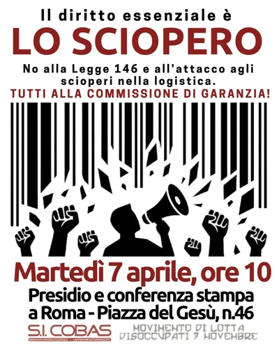 Radio Onda Rossa - Tuesday, April 7, 2026Martedรฌ 7 aprile 2026 sit-in a piazza del Gesรน a Roma per la salvaguardia del diritto di sciopero nel settore della logistica. A seguire il comunicato del SI-Cobas.