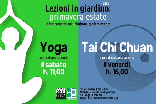 Casale Podere Rosa - Tuesday, April 7, 2026YOGA: il sabato mattina h.11 THAI CHI: il venerdì pomeriggio h.16 INFORMAZIONI: – Le date vengono programmate di settimana in settimana a seconda delle condizioni atmosferiche; – Costo singola lezione: 12€ – Le lezioni sono riservate ai soci 2026 (vedi info iscrizione) – Prenotazione: inviare –entro le ore 12 del giorno precedente alla lezione– una …