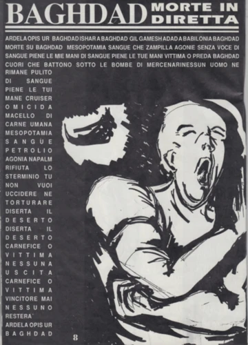 "MORTE SU BAGHDAD MESOPOTAMIA SANGUE CHE ZAMPILLA AGONIE SENZA VOCE DI SANGUE PIENE LE MIE MANI DI SANGUE PIENE LE TUE MANI VITTIMA O PREDA BAGHDAD CUORI CHE BATTONO SOTTO LE BOMBE DI MERCENARI"
