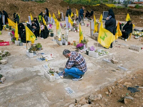 Su quasi tutte sventola la bandiera gialla con il pugno alzato che brandisce un AK-47 verde, l’emblema di Hezbollah. Donne vestite interamente di nero, il volto avvolto in un velo rigoroso e il corpo coperto da un’abaya, sedute in gruppi per terra, parlano vicino ai loro padri, fratelli, mariti, sepolti lì.