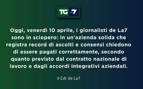 Ancora in Marcia! - Friday, April 10, 2026Esprimiamo la nostra solidarietà ai giornalisti di La7, che sono in sciopero per richiedere una retribuzione corretta, come previsto dal contratto e dagli accordi di settore, e l’assunzione a tempo indeterminato dei loro colleghi precari.