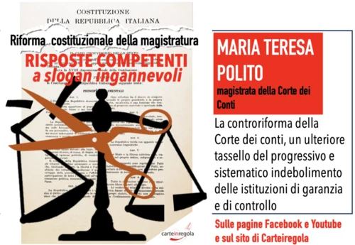 Dopo l’esito del referendum, con l’ampia bocciatura degli elettori della riforma della magistratura voluta dalla maggioranza di centro destra, l’Associazione magistrati della Corte dei conti ha chiesto al Governo di rimettere mano alla parallela riforma della magistratura contabile* che presenta numerose criticità. Pubblichiamo l’intervento di Maria Teresa Pòlito, Presidente aggiunto onorario della Corte dei conti, tratto dal libro di Carteinregola “Riforma della magistratura: Risposte competenti a slogan ingannevoli” (in calce la registrazione video)