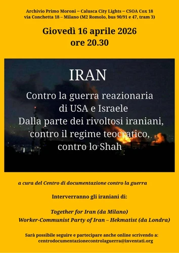 Questa sera , giovedì 16 aprile 2026 alle ore 20.30 si parla di Iran al CS Conchetta di via Conchetta a Milano. Incontro dal titolo ” IRAN – Contro la guerra reazionaria di Usa e Israele. Dalla parte dei rivoltosi iraniani, contro il regime teocratico, contro lo Shah” a cura del Centro di documentazione contro la guerra.