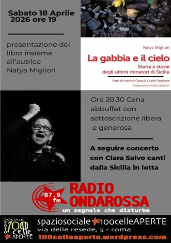 Radio Onda Rossa - Thursday, April 16, 2026In comunicazione telefonica con un compagno della radio e con la cantante siciliana Clara Salvo abbiamo presentato la serata organizzata da Radio Onda Rossa, questo sabato 18 aprile allo Spazio Sociale 100celleAperte, con la presentazione del libro "La gabbia e il cielo: storia e storie degli ultimi minatoria in Sicilia", della scrittrice Natya Migliore, e con i canti popolari siciliani interpretati da Clara.