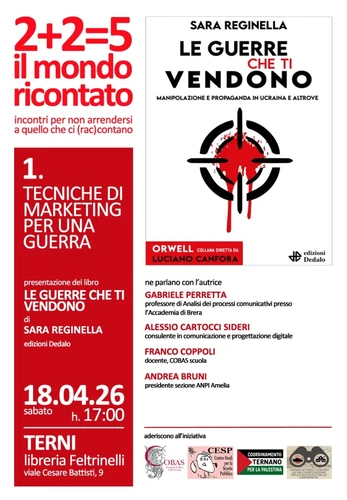 Questa presentazione vuole essere il primo appuntamento di “2+2=5 – il mondo ricontato“, una serie di incontri e dialoghi “non omologati” per riflettere in modo indipendente su un mondo sempre più pericolosamente in bilico tra guerre, cambiamenti geopolitici e climatici, propaganda, censura, narrazioni mediatiche distorte. Un mondo distopico in cui, citando appunto il celebre “1984” di Orwell, i piani vengono rovesciati: la guerra è pace, la libertà è schiavitù, l’ignoranza è forza.
