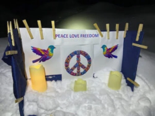 Il lunedì di Pasqua, sette membri del Consiglio di Pace di Regina si sono riuniti davanti al Comune per accendere delle candele. Le candele erano elettriche perché, come ha detto uno di noi, il cortile del municipio è un tunnel del vento!
