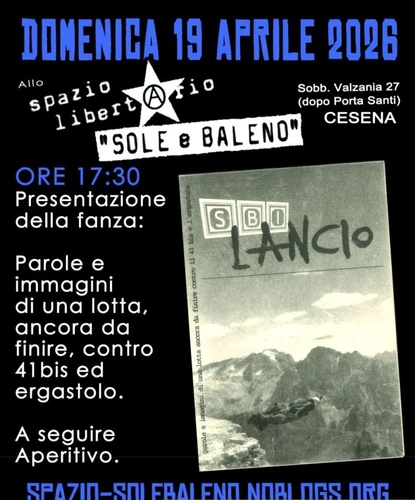 La Nemesi - Friday, April 17, 2026Presentazione della fanzine “Sbilancio”, parole e immagini della lotta ancora da finire contro il 41 bis e l’ergastolo presso lo Spazio Libertario “Sole e Baleno” (Cesena, 19 aprile 2026) DOMENICA…
