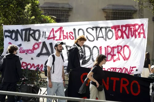 Proprio oggi il Tribunale di Torino ha condannato diciotto compagne e compagni di area anarchica nel processo per gli scontri durante un corteo del marzo 2023 in solidarietà ad Alfredo Cospito, militante anarchico tuttora detenuto in regime di isolamento e che in quel periodo stava sostenendo uno sciopero della fame proprio per protestare contro il 41 bis. I giudici hanno inflitto condanne dai cinque anni e sei mesi di reclusione ai 18 mesi di arresto. La corte ha escluso il reato di devastazione ma ha accolto l’accusa di concorso in “minaccia a pubblico ufficiale”.