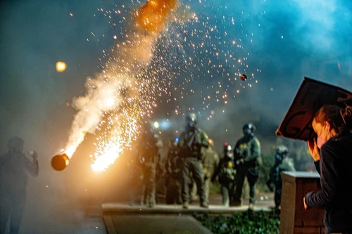 L’immagine in intentastazione è stata scattata da Mark Graves domenica 1 febbraio 2026 al centro ICE a Portland. Era la seconda volta di fila che agenti federali attaccavano i manifestanti con agenti chimici.