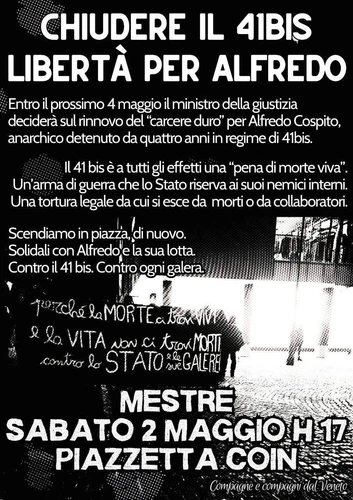 Mestre, sabato 2 maggio: Scendiamo in piazza per Alfredo e contro il 41bis!