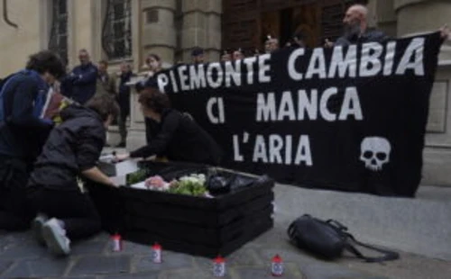 Una decina di persone, vestite di nero e con il viso coperto da mascherine antismog, ha depositato una bara di fronte all’ingresso, srotolando poi uno striscione con la scritta “Piemonte cambia: ci manca l’aria” che allude al caso Chiorino – Del Mastro e allo scandalo della Bisteccherie d’Italia che ha travolto la giunta regionale ma anche alla tragica situazione dell’inquinamento atmosferico e alle migliaia di morti premature che causa.