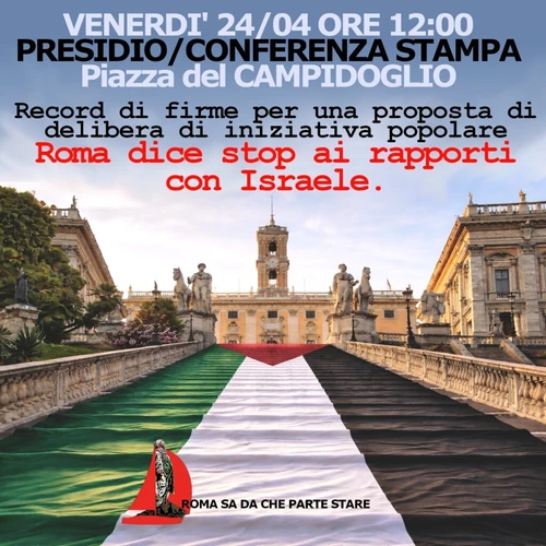 Venerdì 24 aprile, alle 12.00, il Comitato “Roma sa da che parte stare” terrà una conferenza stampa in Piazza del Campidoglio. Domenica 26 aprile, dalle 17.30, è convocato un incontro pubblico, cui seguirà una manifestazione spettacolo, presso il Circolo ARCI “Concetto Marchesi”, in Via del Frantoio 9/c. Sono invitate a partecipare tutte le realtà che in tanti modi hanno sostenuto la raccolta delle firme e che non vogliono che la nostra città sia ancora complice del genocidio del popolo palestinese e delle guerre infinite di Israele contro i popoli del Vicino Oriente.