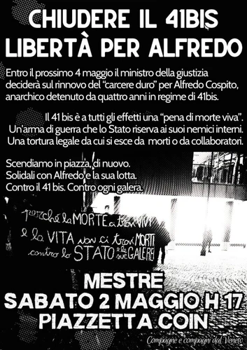 Brughiere - Wednesday, April 22, 2026Diffondiamo: Sabato 2 maggio alle ore 17 in piazzetta coin a Mestre (Venezia) per insistere ancora contro la tortura di Stato e le sue carceri di guerra. Al fianco di Alfredo con Sara e Sandro nel cuore. Entro il prossimo 4 maggio il ministro della giustizia deciderà sul rinnovo del “carcere duro” per Alfredo Cospito, … Leggi tutto "MESTRE: IN PIAZZA CONTRO IL 41BIS"