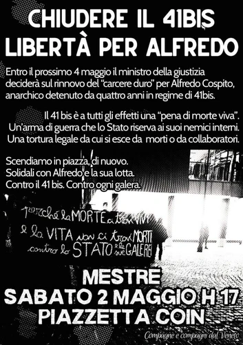 In piazza contro il 41 bis. Chiudere il 41 bis. Libertà per Alfredo (Mestre, 2 maggio 2026) Sabato 2 maggio alle ore 17 in piazzetta Coin a Mestre (Venezia) per…