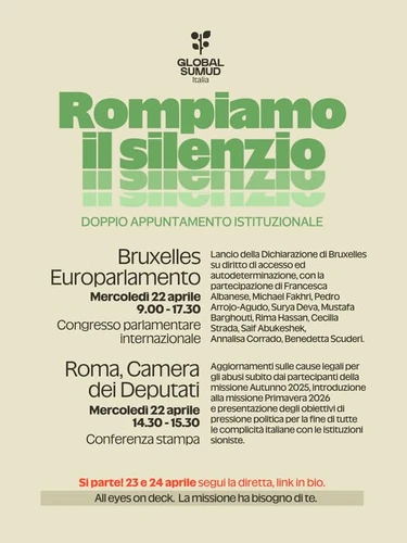 La delegazione italiana della Global Sumud Flotilla ha tenuto oggi, mercoledi 22 aprile, una conferenza stampa alla Camera dei Deputati a Roma per annunciare l’imminente partenza, per discutere i punti e le fasi della missione e continuare a fare pressione sul governo italiano perché cessi immediatamente ogni cooperazione militare ed economica con Israele. Nel corso della conferenza stampa ci sono stati aggiornamenti in merito ai dettagli del processo che vede coinvolto l’equipaggio italiano come parte lesa per il trattamento ricevuto dal rapimento in acque internazionali alle carceri israeliane.