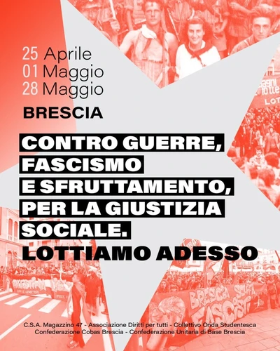 25 APRILE – 1 MAGGIO – 28 MAGGIO 2026: “LOTTIAMO ADESSO”. COMUNICATO DELLE REALTA’ DI MOVIMENTO E DI BASE A BRESCIA.
