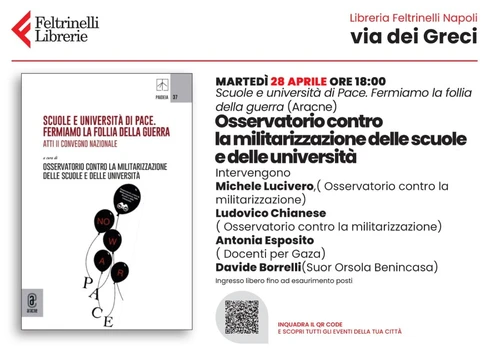 Martedì, 28 aprile alle ore 18.00 presso la Libreria Feltrinelli a Napoli in via dei Greci si terrà la presentazione del volume di recente pubblicazione “Scuole e Università di pace. Fermiamo la follia della guerra” (Aracne, 2026), che raccoglie gli atti del II Convegno Nazionale dell’Osservatorio contro la militarizzazione delle scuole e delle università.