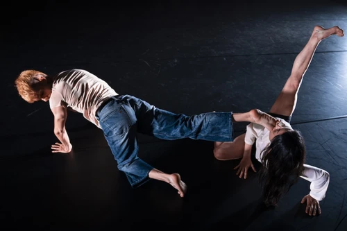 In una scena vuota, con fari quasi a terra e molte bottiglie d’acqua per improvvisare fontanelle e giochi da ragazzi voluttuosi, i quattro performer cominciano costruendo partiture soliste per dare vita poi a duetti, terzetti e quartetti. Soprattutto la magnetica presenza di Samira Cogliandro funziona da perno per l’intera coreografia. A volte la schiena, a volte i polpacci, a volte le mani o la bocca, sono parti di corpo su cui si costruisce il dialogo tra i performer che alternano relazioni a distanza a contact improvisation, senza però innescare mai un qualche tipo di narrazione esplicita o di rapporto più stringente. C’è armonia nel gruppo, ma anche differenze. Siamo nel tempo della giovinezza, ma due performer viaggiano dentro i vent’anni mentre la danzatrice e l’altro performer cavalcano felicemente i trent’anni. Anche questo contribuisce a creare dinamiche mobili di seduzione, di magistero, di attrazione.