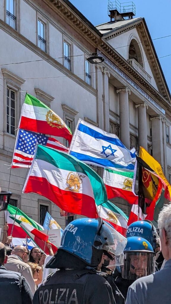 Arrivo alle 14.20, a piedi, dal centro, vado quindi verso la testa del corteo già partito da Porta Venezia. Risalgo, ma dopo diverse decine di gonfaloni ecco subito lo schiaffo in faccia: un cordone di City Angels e polizia a difendere un’accozzaglia (perdonatemi il termine) di uomini e donne: ognuno di loro con un cartello o una bandiera. Dietro lo striscione della solita brigata ebraica in cerca di protagonismo, una serie di bandiere: israeliane, statunitensi, ucraine, iraniane (quelle dello Scià), forza Italia, cartelli con volti di Trump, Netanyahu, Reza Palhavi e altri impresentabili.
