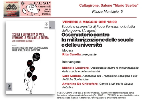 Venerdì, 8 maggio alle ore 18.00 presso il Salone “Mario Scelba” del Comune di Caltagirone (CT) si terrà la presentazione del volume di recente pubblicazione “Scuole e Università di pace. Fermiamo la follia della guerra” (Aracne, 2026), che raccoglie gli atti del II Convegno Nazionale dell’Osservatorio contro la militarizzazione delle scuole e delle università.
