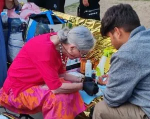 Una sera è arrivato alla nostra ‘panchina della cura’ un uomo che avrà avuto 30 anni ma ne dimostrava il doppio, tanto il suo corpo era devastato, ed è stato difficile per me intervenire su quelle ferite che non riesco nemmeno a descrivere; non osavo incrociare il suo sguardo e quando alla fine l’ho fatto ho capito che ciò che non osavo guardare era il mio stesso trauma, sapendo che a 100 km da qui nella bellissima Croazia (vi invito a boicottare la Croazia), ci sono ragazzi che muoiono annegati. I morti di cui non si saprà mai nulla e di cui noi ricamiamo i nomi su questo ‘lenzuolo della memoria’: sono soprattutto i ragazzi migranti che li ricamano…”. E sul primo piano dei nomi ricamati in rosso sul bianco del lenzuolo, Lorena si scusa ma deve proprio andare: “Stanno arrivando sempre più persone, la Piazza mi chiama…”