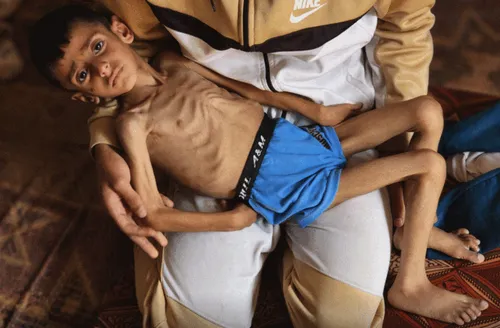 (Foto: il bambino palestinese Osama Kamal Al Rakab lotta per sopravvivere, Khan Yunis, Gaza, 14 aprile 2025. Di Anadolu Agency).