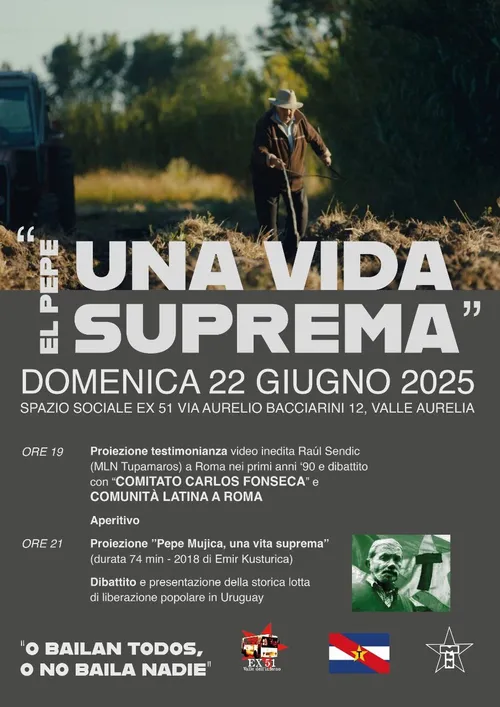 Proponiamo un incontro cinematografico sulla storia dei Tupamaros — Movimento di Liberazione Nazionale e sulle lotte uruguayane, attraverso il dialogo con il "Comitato Carlos Fonseca" e la Comunità Latina a Roma. Confronto aperto tra le persone partecipanti e proiezione del film-documentario di Emir Kusturica (del 2018) sulla vita di José "Pepe" Mujica durante gli anni (2010—2015) della sua presidenza dell'Uruguay. Inoltre verranno proiettati documenti video inediti custoditi nell'"Archivio Storico dei Movimenti"— https://www.armoroma.org/.