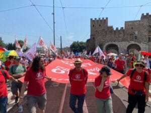 La manifestazione nazionale di oggi rientra nella settimana di mobilitazione europea, che si tiene dal 21 al 29 giugno in occasione del vertice della Nato a L’Aja, che proprio in questi giorni definirà i dettagli del gigantesco piano di riarmo deciso dall’Unione Europea.