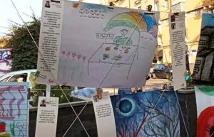 L’allegria di questo tranquillo e caldo pomeriggio di fine settimana ha avuto, tuttavia, un contraltare doloroso. Sono stati i disegni dei bambini di Gaza, già in mostra alla CGIL, che rappresentano non solo bombe e carri armati ma anche quotidianità e bellezza, per lo più perdute. Chi voleva, poteva scegliere e acquistare una delle riproduzioni in cartolina o prenotare la copia ingrandita del disegno prescelto.