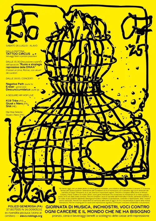 Scirocco - Wednesday, June 25, 2025Segnaliamo questa importante iniziativa che si terrà ad Alavo- Laboratorio per l’autogestione, a Polizzi Generosa. Ecco il testo di lancio “Ha senso oggi, con un piede dentro la terza guerra mondiale, una iniziativa specifica contro il carcere? C’è ancora tempo per tenere insieme l’attenzione alle condizioni di chi è rinchiuso/a con il pensiero agli occhi …