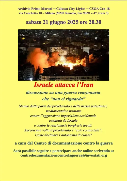 Centro di documentazione contro la guerra - Thursday, June 19, 2025Archivio Primo Moroni ─ Calusca City Lights ─ CSOA Cox 18 via Conchetta 18 – Milano (MM2 Romolo, bus 90/91 e 47, tram 3) sabato 21 giugno 2025 ore 20.30 ISRAELE ATTACCA L’IRAN discussione su una guerra reazionaria che “non ci riguarda” Stiamo dalla parte del proletariato e delle masse palestinesi, mediorientali e […]