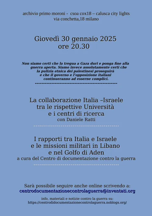 Centro di documentazione contro la guerra - Thursday, January 23, 2025Archivio Primo Moroni – Calusca City Lights – CSOA Cox 18 via Conchetta 18 – Milano (MM2 Romolo, bus 90/91 e 47, tram 3) Giovedì 30 gennaio 2025 ore 20.30 Non siamo certi che la tregua a Gaza duri e ponga fine alla guerra aperta. Siamo invece assolutamente certi che la pulizia etnica […]
