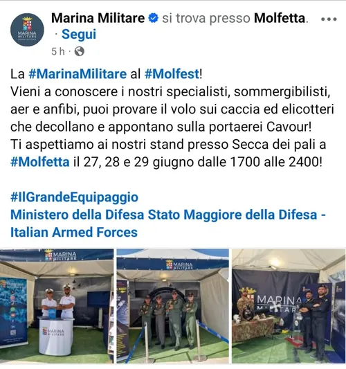 E, in particolare, la presenza delle Forze Armate al Molfest rientra in una delle “azioni specifiche” del Programma di Comunicazione 2025, infatti: «Per azioni specifiche si intendono le iniziative di comunicazione con cui il Dicastero intende proiettarsi all’esterno. Si continueranno ad utilizzare i tradizionali canali di interazione, ma per tutti vale il tassativo indirizzo che su questi canali, sempre, si dovrà far riferimento a un’unica realtà identitaria che si sintetizza con il termine “DIFESA”. In particolare i canali sono: eventi e attività aperti alla partecipazione della società civile, quali saloni, mostre, convegni, incontri culturali, seminari nelle scuole, ecc. continueranno a svolgere una funzione importante quali occasioni per esprimere le eccellenze peculiari della Difesa. Le manifestazioni di interesse dovranno essere individuate sulla base di criteri che tengano conto di idonei criteri tematici, geografici e temporali, della reputazione delle società organizzatrici, della pertinenza dei contenuti e dell’adeguatezza dei contesti di svolgimento».